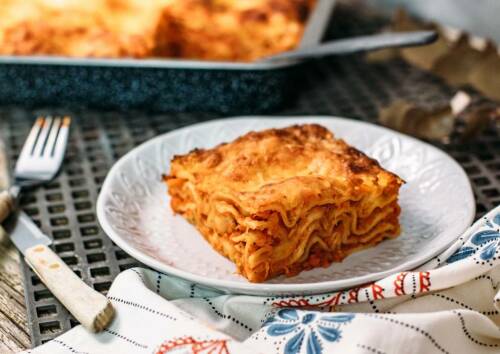 Mittagessen: Kohlrabi-Lasagne wird mit proteinreichem Mozzarella gratiniert und punktet mit einer ballast- und nährstoffreichen Füllung aus gebackenen Möhren, Superfood Kohlrabi, passierten Tomaten und italienischen Kräutern.