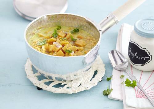 Abendessen: Süßkartoffel-Linsen-Curry aus ballaststoffreichen Hülsenfrüchten sättigt im Mix mit wertvollem Protein – den essentiellen Aminosäuren sei Dank – besonders intensiv. Für exotische Nuancen sorgen Kokos, Ingwer, Curry, Limette und Kreuzkümmel. Das Baobao-Pulver kannst du bei Bedarf einfach weglassen. Bereite direkt 2 Portionen – 1 Portion für morgen Mittag – zu.