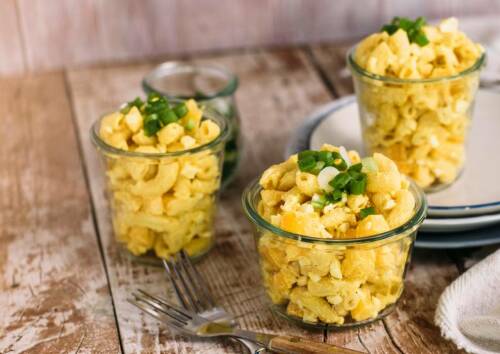 Nudelsalat ist einfach etwas Tolles. Dieser hier kombiniert frische Aromen von gelber Paprika mit orientalischer Würze von Curry mit cremigem Ei. Die klassisch verwendete Mayo kannst du – wenn du es etwas figurfreundlicher haben magst – ganz leicht durch etwas Joghurt ersetzen.