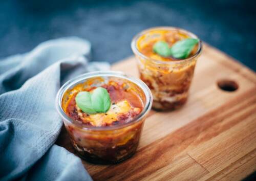 Ein besonders raffiniertes Gericht ist die Lasagne im Glas. Sie wärmt nicht nur, sondern lässt sich auch super portionieren. Damit eignet sie sich außerdem hervorragend für Partys oder mehrgängige Menüs. Natürlich kannst du einfach etwas mehr kochen und die überschüssigen Portionen am nächsten Tag unkompliziert aufwärmen.