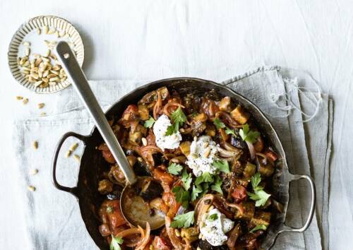 Manchmal geht es doch beim Kochen darum, etwas Neues auszuprobieren. Wie zum Beispiel dieses Auberginen-Ragout mit feinen Aromen von roten Zwiebeln, Korinthen, Kapern, Pinienkernen und Petersilie. Durch die Vielfalt an Gewürznoten ergibt sich ein deftiges, mediterranes Gericht, das dennoch nicht schwer im Magen liegt.
