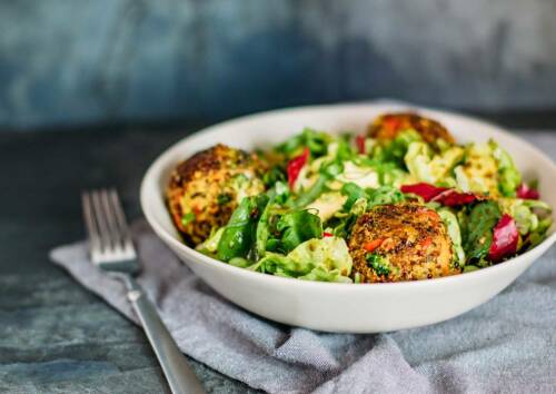 In letzter Zeit stehe ich total auf alle Varianten von Salat-Bowls. So auch diese. Hierzu brätst du aus Quinoa und vielerlei Gemüse bunte Bällchen an und setzt diese auf ein Bett aus frischem Salat. Dazu empfehle ich dir unseren leckeren Curry-Dip, verrühre einfach Schmand mit Currypulver, Honig und Senf zu einer glatten Masse und serviere sie zu den Bällchen im Salat.