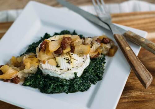 Freitag: Gebackener Camembert auf Spinatbett mit Birnen-Rosinen-Chutney