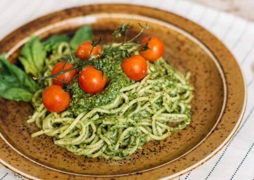 Pasta mit Pesto ist nicht nur was für Studenten, auch wenn es diese vor allem wegen der schnellen Zubereitung und Einfachheit lieben. Diese Vorteile kannst auch du dir zu Nutze machen und in 30 Minuten ein leckeres Dinner kochen. Das selbstgemachte Pesto punktet mit einer Extraportion Frische durch Blattspinat und Pistazien. Zusammen mit hochwertigem Olivenöl braucht es sich auch geschmacklich nicht verstecken. Dazu ein paar Cherrytomaten und fertig ist ein einfaches Abendessen mit nur wenigen Zutaten.