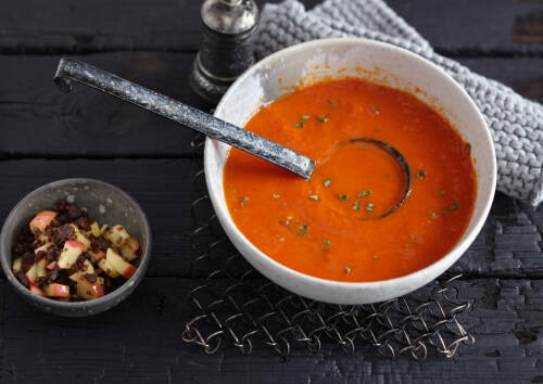 Tomatensuppe kennt jeder – nicht aber die Variante mit Paprika. Die Suppe wird klassisch mit Paprika, Gemüsebrühe und Dosentomaten zubereitet, jedoch das Interessante ist das Topping. Denn da geht es fruchtig zu! Angebratenes Pumpernickel mit Apfelstücken und Zitronensaft sorgen für frische Aromen in der sonst herzhaften Suppe. Lass es dir schmecken.