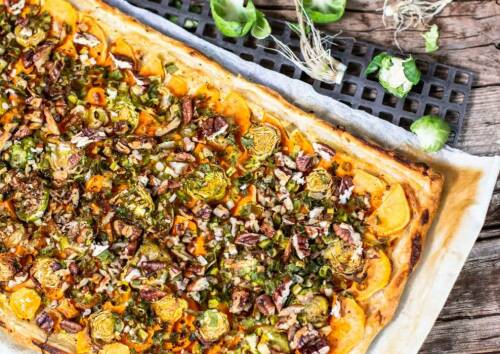 Süßkartoffeln mag ich in jeder Form und Zubereitungsart. Eine abwechslungsreiche Variante stellt dabei unsere Blätterteigteig-Tarte dar, die mit Rosenkohl, Frühlingszwiebeln und Pekannüssen belegt wird. Crème fraîche und Senf sind eine cremige Grundlage und Chiliflocken, Salz und Pfeffer sorgen für die richtige Würze. Mhm ...