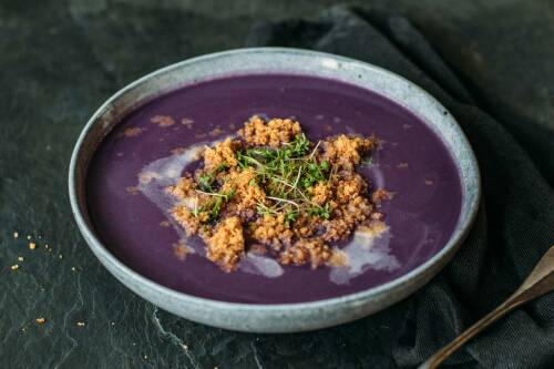 Unsere Rotkohlsuppe ist der Hingucker schlechthin! Doch sie sieht nicht nur gut aus, in ihr stecken auch viele wertvolle Zutaten. Die Zubereitung erfolgt auf der Basis von Rotkohl, Kartoffeln und Äpfeln. Dazu gesellen sich Thymian und Muskat und zum Schluss als leckeres Topping: Knoblauch-Semmelbrösel. Das solltest du dir nicht entgehen lassen.