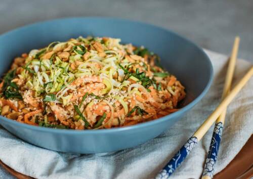 Frische Zutaten vereint auch dieses Gericht, inspiriert von Fernost. Ingwer, Sesamöl und Thaibasilikum verleihen den Zoodles eine gewisse Schärfe und machen aus den Karotten eine echte Leckerei. Diese Bowl garantiert dir asiatische Aromen auf dem Tisch.