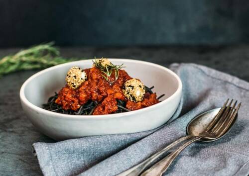 Dieses Gericht ist ein wahrer Hingucker! Die Schwarze Bohnen Spaghetti punkten mit ihrem Eiweißgehalt und die dunkelrote Paprikasoße überzeugt durch ihren Geschmack. Besonderes Highlight sind die in Sesam panierten Mozzarellabällchen, die nicht nur toll aussehen, sondern auch einzigartig schmecken.