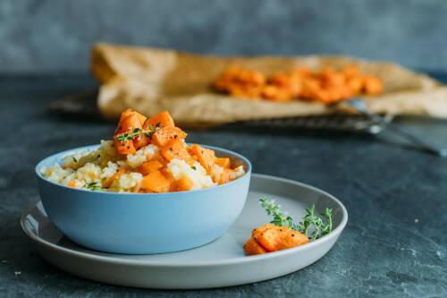 Risotto gehört zu den Klassikern der italienischen Küche. Doch wusstest du, dass du es nicht nur mit Pilzen oder Kürbis zubereiten kannst, sondern auch mit Süßkartoffeln und Bohnenkraut? Dazu sorgen Weißwein, Olivenöl und Knoblauch trotzdem für den bekannten Risotto-Geschmack und die neuen Zutaten bringen etwas Abwechslung in deine Küche.