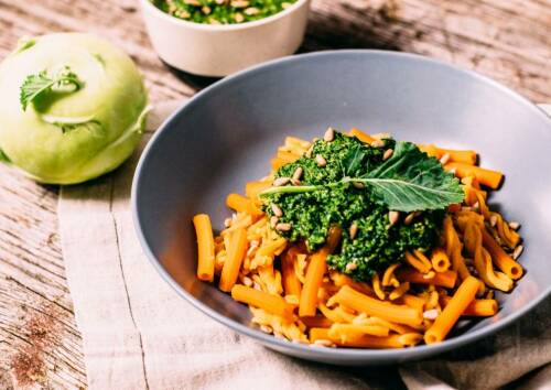 Pasta aus Hülsenfrüchten wie roten Linsen oder Erbsen und aus Buchweizen-, Mais- oder Reismehl ist schon längst nicht mehr aus den Küchen gesundheitsbewusster Feinschmecker wegzudenken. Besonders raffiniert und proteinreich ist eiweißreiche Linsenpasta mit unserem selbstgemachte Pesto. Voilà: Linsennudeln mit Kohlrabi-Pesto.