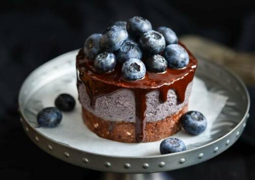 Anbei entzückend-kleine Torten, die nicht nur weizenfrei sondern auch vegan und rohköstlich sind: Rohe Törtchen mit Heidelbeeren.