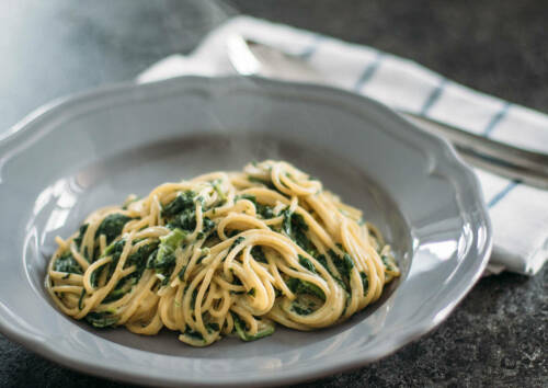 Zarten Spinat kannst du auch ideal für leckere Pastagerichte verwenden. Aufgrund der zarten Struktur reicht es vollkommen aus, die geputzten Spinatblätter kurz vor dem Servieren unter das heiße Pastagericht zu heben – das zarte Grün zerfällt sofort beim Unterheben.