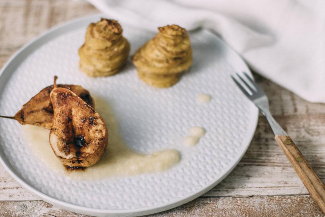 Neugierig geworden? Das ausführliche Rezept für Veganeshas Zwiebelmousse mit Schritt-für-Schritt-Anleitung zum Nachkochen findest du im Rezept Geschmorte Birnen auf weißem Schokopüree mit Kartoffelgratin–Türmchen!