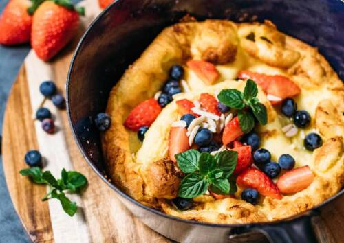 Es muss nicht immer deftig sein. Die Kleinen der Familie kann man oftmals auch mit was Süßem überzeugen. Dutch Babies sind Pfannkuchen, die nach unserem Rezept ganz ohne Zucker auskommen, aber durch frische Beeren trotzem ein Genuss sind.