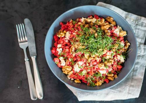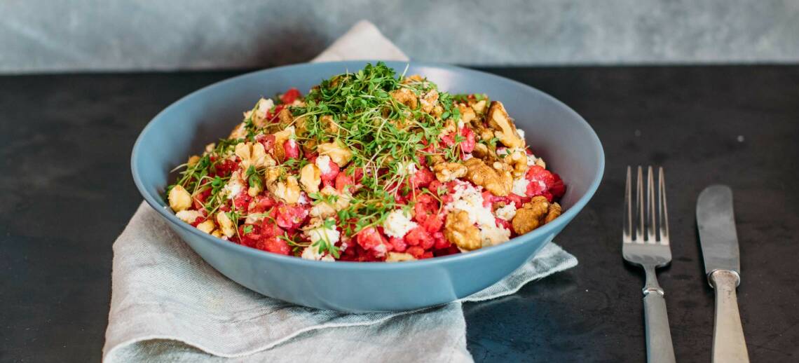 Kinder lieben Spätzle. Und Buntes. Dieses Gericht überzeugt mit Beidem. Die knallig pinken Spätzle erhalten durch die Roten Bete ihre leuchtende Farbe und sorgen somit für Spaß auf dem Teller. Verfeinert mit Frischkäse, Walnüssen und Kresse bietet dieses Rezept auch für Erwachsene ein echtes Geschmackserlebnis.