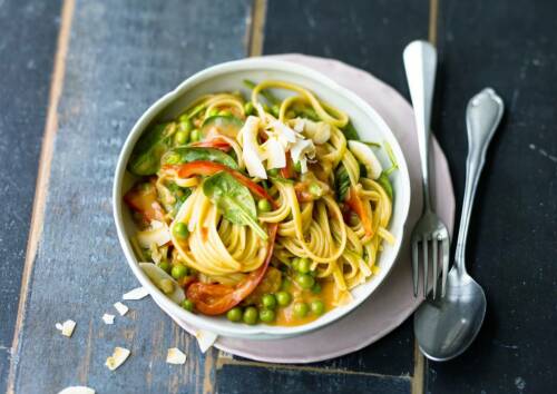 Samstag: Kokos-Tomaten-Nudeln mit Spinat