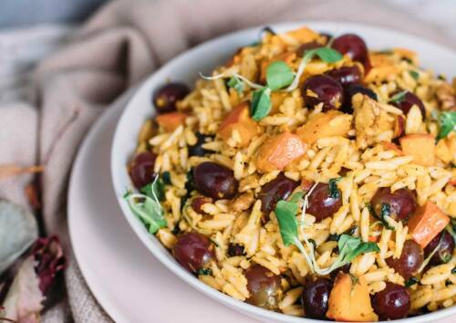 Es gibt Zeiten, da kann ich einfach nicht genug von Nudelsalat bekommen. Das Schöne an ihm ist, dass er sich vielfach abwandeln lässt. Dieses Rezept mit griechischen Reisnudeln, Kürbis und Feldsalat ist besonders lecker. Den letzten Kick verleihen blaue Trauben. Ein Traum. Du kannst ihn lauwarm oder kalt servieren – your choice.