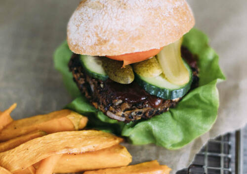 Freitag: Burger mit schwarzem Bohnen-Patty und Süßkartoffel-Pommes