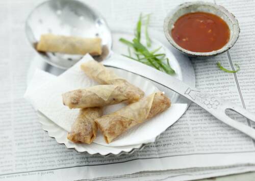 Die neue Woche startet mit einem bunten Mix aus nährstoffreichen Zutaten wie Möhre, Weißkohl, Frühlingszwiebeln und Sprossen in knuspriger Teigrolle. Für asiatisches Flair sorgen Glasnudeln, Limette und Sojasoße. Zum Dippen wird ganz klassisch eine süße Chilisoße dazu gereicht.