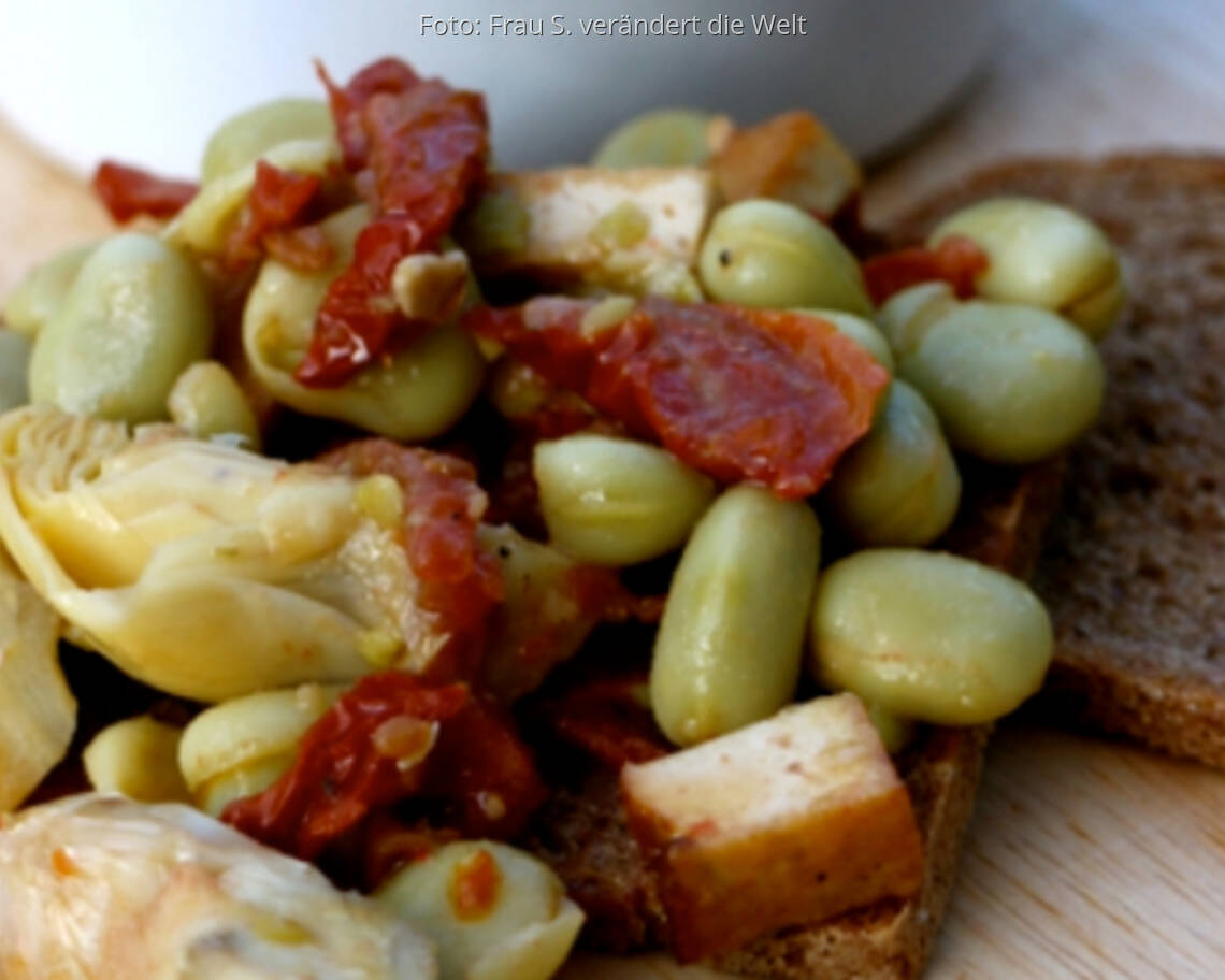 mit dicke Bohnen aus dem Glas, Artischockenherzen aus dem Glas, getrocknete, in Öl eingelegte Tomaten, Räuchertofu