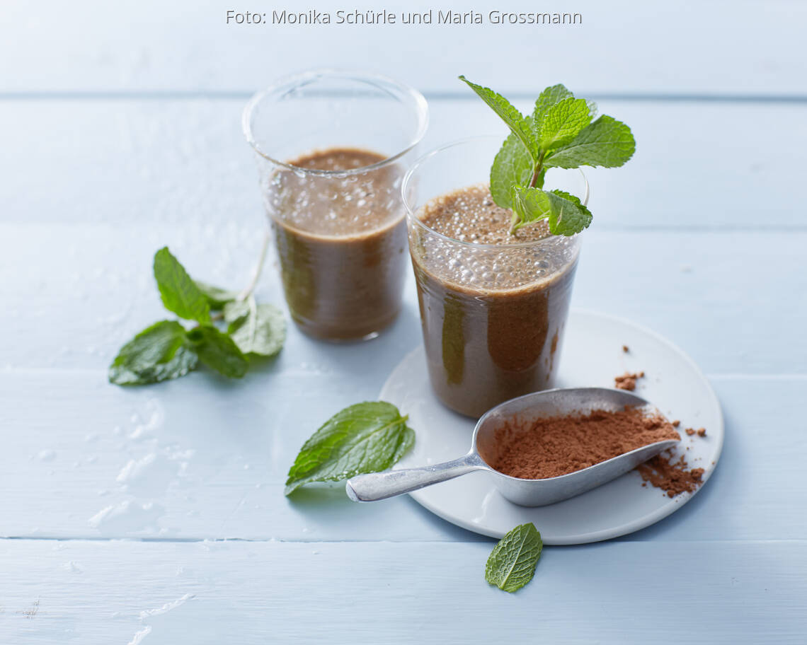 Die Bananen schälen, in grobe Stücke schneiden und in den Mixer geben. Die Minze waschen. Die Minze mit dem Kakao und Wasser ebenfalls in den Mixer geben. Alles auf höchster Stufe mixen, bis der Smoothie schön cremig ist.