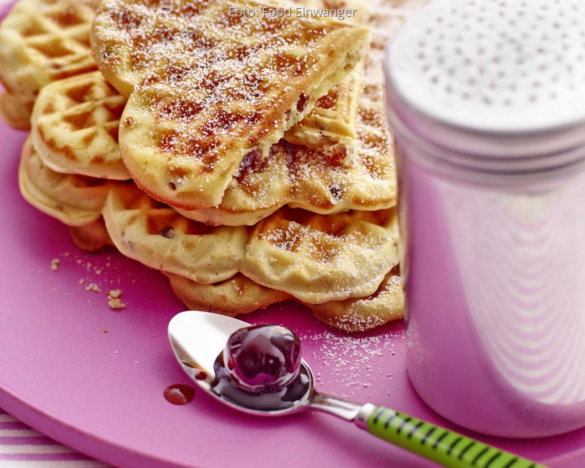 Das Waffeleisen auf mittlerer Hitzestufe vorheizen. Wenn die Backtemperatur erreicht ist, die Backflächen mit wenig weicher Butter bepinseln. Etwa 3 EL Teig in die Mitte der unteren Backfläche geben und das Waffeleisen ohne Druck schließen. Waffel in ca. 3 Min. goldgelb backen. Auf ein Kuchengitter legen, sodass die Waffel etwas auskühlen kann. Weitere Waffeln backen, bis der Teig aufgebraucht ist. Die warmen Waffeln mit Puderzucker bestäuben und servieren.