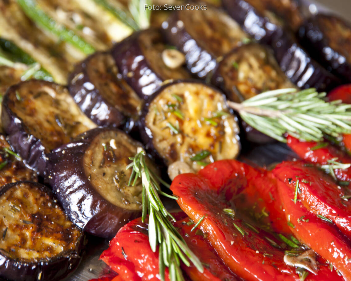 Aubergine in 1/2 cm dicke Scheiben schneiden, diese einsalzen. Zucchini entweder in Scheiben oder 4 cm lange Stücke schneiden, diese Stücke vierteln (so dass Dreiecke entstehen). Paprika putzen, in grobe Stücke schneiden. Champignons putzen und halbieren.