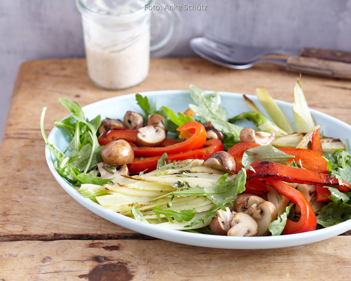mit rote Paprikaschote, Fenchelknolle, Champignons, Thymian