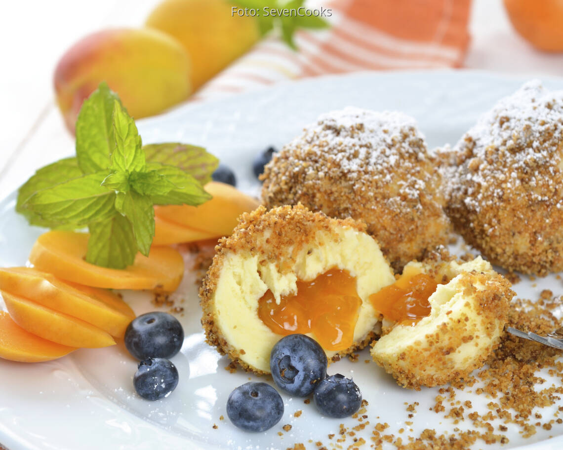 Den Teig zu einer Rolle formen, jeweils eine Scheibe abschneiden und flach drücken. Aprikose mit dem Teig umhüllen und komplett verschließen. Zu runden Knödel formen. Die Früchte sollen nur dünn mit Teig umwickelt sein.