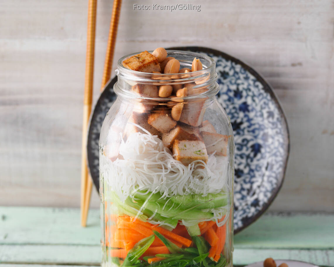 Zuerst das Dressing in das Glas gießen. Dann nacheinander Kohl, Zuckerschoten, Möhre und Gurke darüberschichten. Nudeln und Tofu daraufgeben. Mit den Erdnüssen bestreuen. Das Glas verschließen und (über Nacht) in den Kühlschrank stellen. Zum Essen den Salat auf einen Teller stürzen und vorsichtig mischen.
