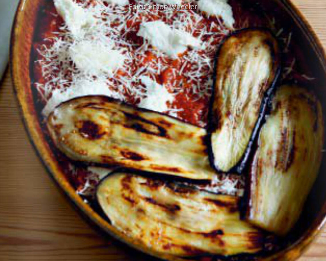 vegetarisches Rezept von Hugh Fearnley-WhittingstallSo bereite ich große Auberginen am liebsten zu. Nehmen Sie sich dafür etwas Zeit – ideal für einen Regennachmittag in der Küche –, aber einmal vorbereitet, kann es (tief-)gekühlt und später gegart werden.