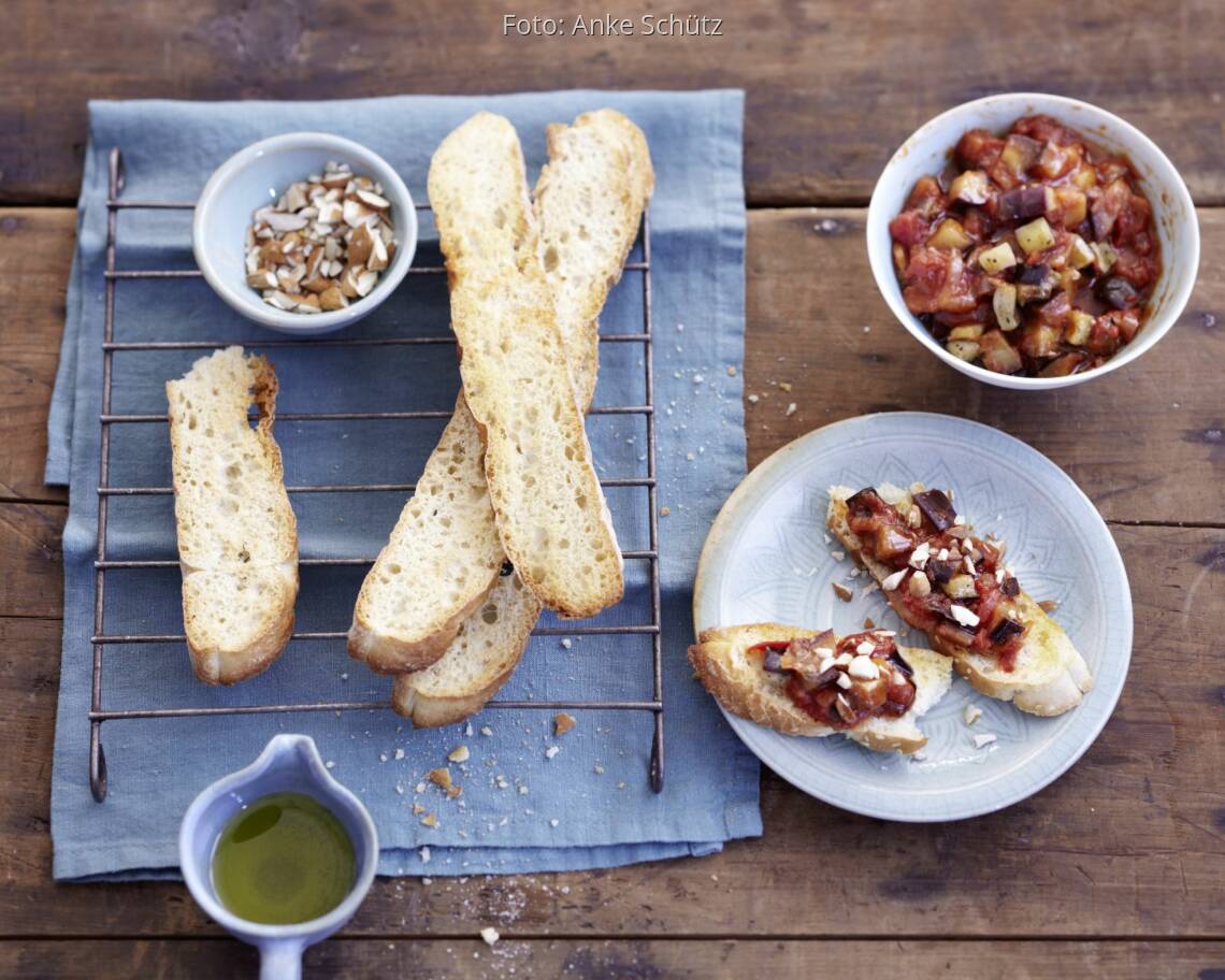 In einer großen Pfanne die Hälfte des Öls erhitzen. Auberginenwürfel mit Küchenpapier gut trocken tupfen, mit der Kräutermischung in die Pfanne geben und bei starker Hitze unter Rühren ca. 3 Min. hellbraun anbraten. Die Tomaten dazugeben und alles 1 – 2 Min. einkochen lassen. Mit Salz, Pfeffer, Sirup und Zitronensaft würzen. Die gerösteten Brote mit dem übrigen Öl beträufeln und die Auberginen darauf verteilen. Mit den Mandeln bestreut servieren.