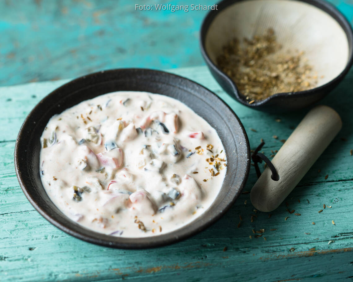 Die Tomate waschen, ohne Stielansatz klein würfeln und mit Joghurt und Aubergine verrühren. Kreuzkümmel und Koriander in einer Pfanne ohne Fett leicht rösten und im Mörser grob zerstoßen. Je nach Geschmack unter den Joghurt rühren. Mit Salz abschmecken. Die Raita ca. 1 Std. kühl stellen.