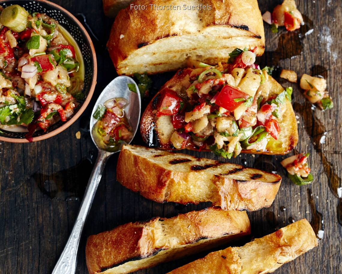 Die Zwiebel schälen und sehr klein würfeln. Die Tomate waschen und ohne den Stielansatz ebenfalls in kleine Würfel schneiden. Die Frühlingszwiebel putzen, waschen und in sehr feine Ringe schneiden. Den Koriander waschen und trocken schütteln, die Blättchen fein hacken. Alles in der Schüssel gut vermengen und mind. 30 Min. ziehen lassen, gerne aber auch länger. Den Salat mit Ciabatta oder gerösteten Baguettescheiben servieren.