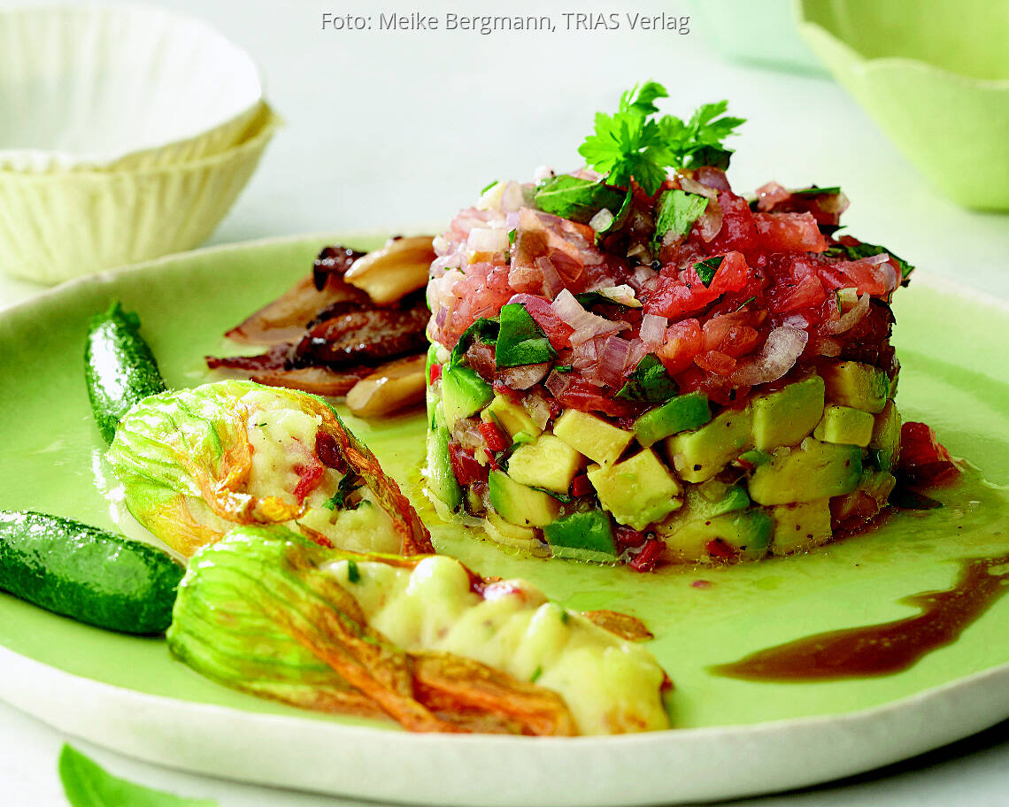 Foto: Meike Bergmann, TRIAS VerlagAvocadotatar mit Tomatenwürfeln an gebratenen Pfifferlingen und gefüllter Kürbisblüte