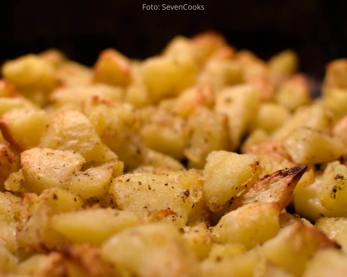 Kräuter-Gewürzmischung über die Kartoffeln streuen und vorsichtig mischen. Die Kartoffeln für ca. 20 Minuten in den Backofen stellen (bis die Kartoffeln goldbraun sind), und anschließend mit etwas Kokosöl beträufeln.