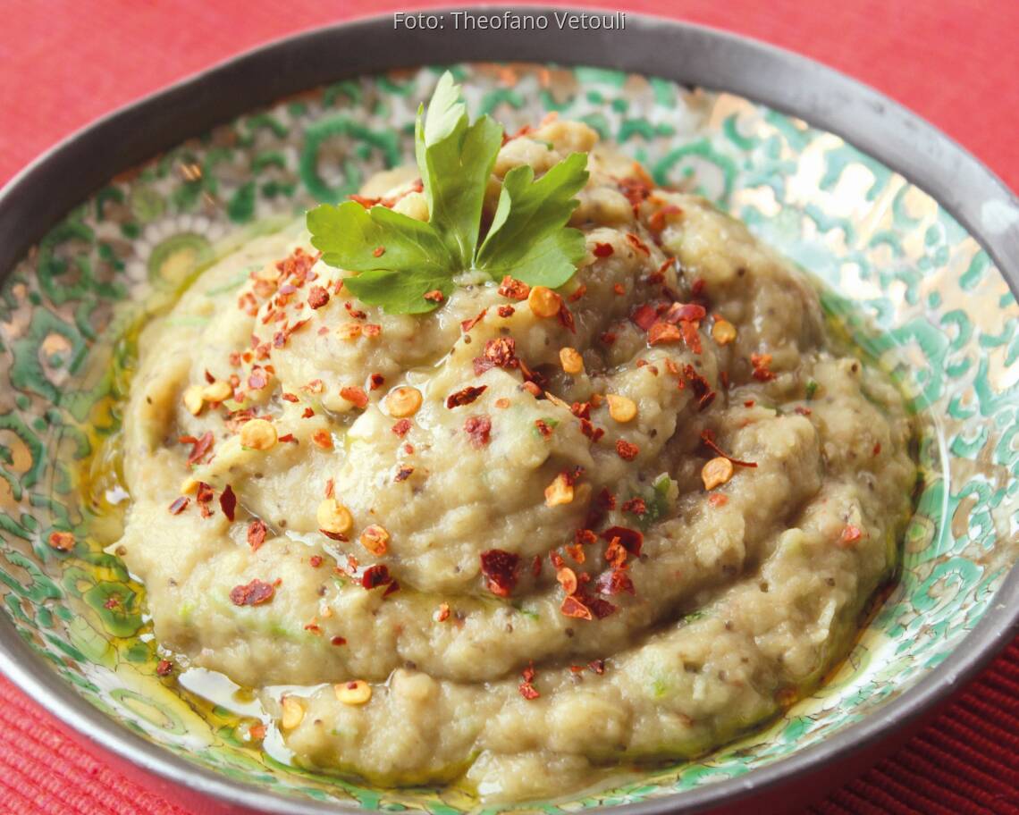 veganes Rezept von Theofano VetouliBaba Ghanoush (arabisch für „verwöhnter Papa“), der bekannte Auberginensalat, kommt ursprünglich aus dem Nahen Osten, ist aber in unterschiedlichen Variationen überall an der Mittelmeerküste verbreitet. Zubereitet als Paste aus gegrillten Auberginen und Knoblauch ist das Baba Ghanoush eine ganz spezielle Köstlichkeit.