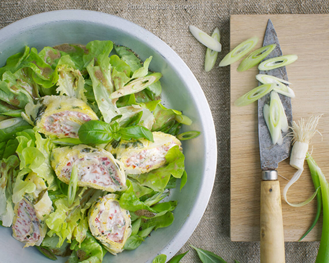 Foto: Barbara BonisolliBasilikum-Tomaten-Rolle mit Blattsalat und Vollkorn-Croûtons