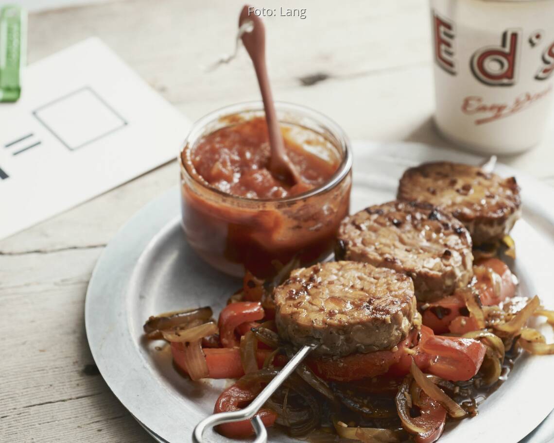 Die Pfanne säubern, dann Öl darin erhitzen. Zwiebel- und Paprikastreifen darin unter Rühren in ca. 5 Min. bissfest garen, dann mit der Tempeh-Marinade ablöschen. Das Gemüse salzen und pfeffern und mit den Tempeh-Spießen und der BBQ-Sauce anrichten.