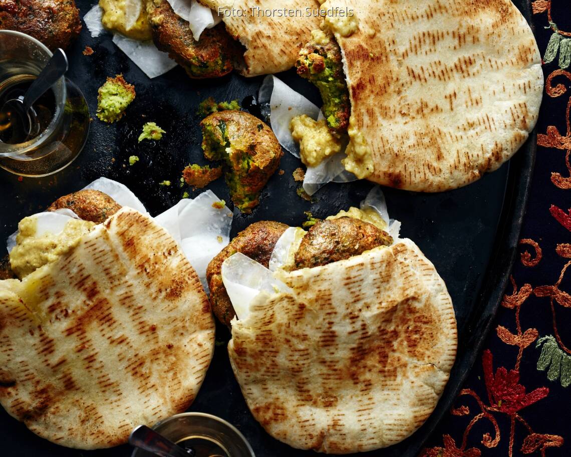 Aus dem Falafelteig mit nassen Händen tischtennisballgroße, flache Bällchen formen. Das Öl in einem hohen Topf erhitzen, bis an einem hineingehaltenen Holzstäbchen sofort kleine Bläschen aufsteigen. Die Falafel in dem heißen Öl portionsweise in ca. 3 Min. knusprig frittieren, dabei immer wieder wenden. Fertige Falafel auf Küchenpapier entfetten und gelegentlich die Öltemperatur per Stäbchenprobe überprüfen.