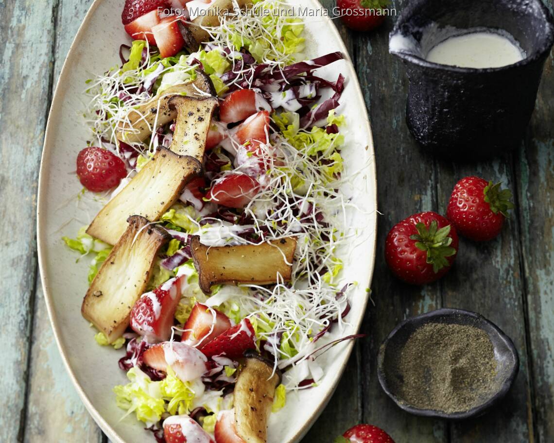 vegetarisches Rezept von Martina KittlerZarter Schmelz von Käse verbindet sich mit fruchtig-pikanten Aromen: Erdbeeren und Romana- und Radicchiostreifen, dazu Kräuterseitlinge und Sprossen on top.