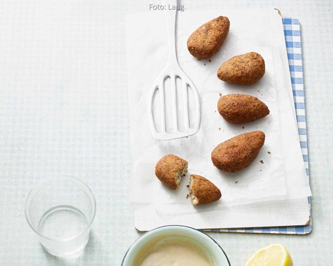 Aus der Blumenkohlmasse mandelförmige Bratlinge formen und im Schmalz bei mittlerer Hitze rundherum in ca. 6 Min. goldbraun ausbacken. Die Falafel mit einem Schaumlöffel aus dem Schmalz heben, kurz auf Küchenpapier abtropfen lassen und dann sofort servieren.