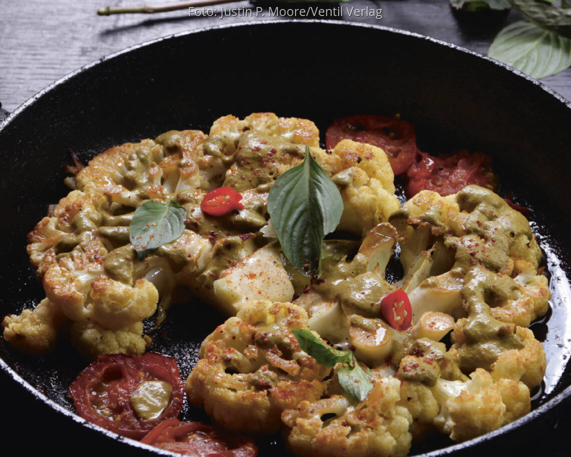 Foto: Justin P. Moore/Ventil VerlagBlumenkohl-Steaks mit Basilikum-Koriander-Zitronensoße