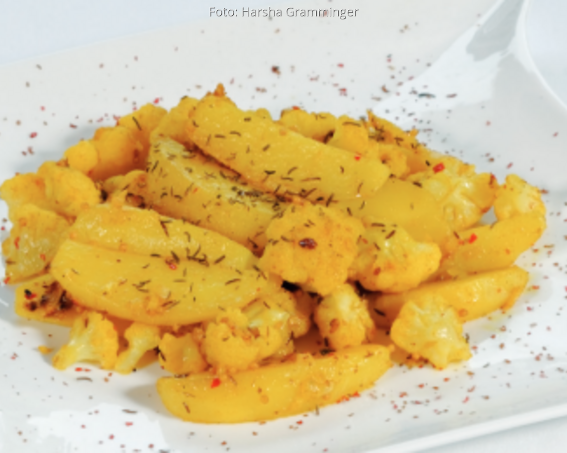 vegetarisches Rezept von Harsha GrammingerBombaykartoffeln mit Blumenkohl wirkt Vata erhöhend ↑ – Pitta neutral – Kapha stimulierend ↓