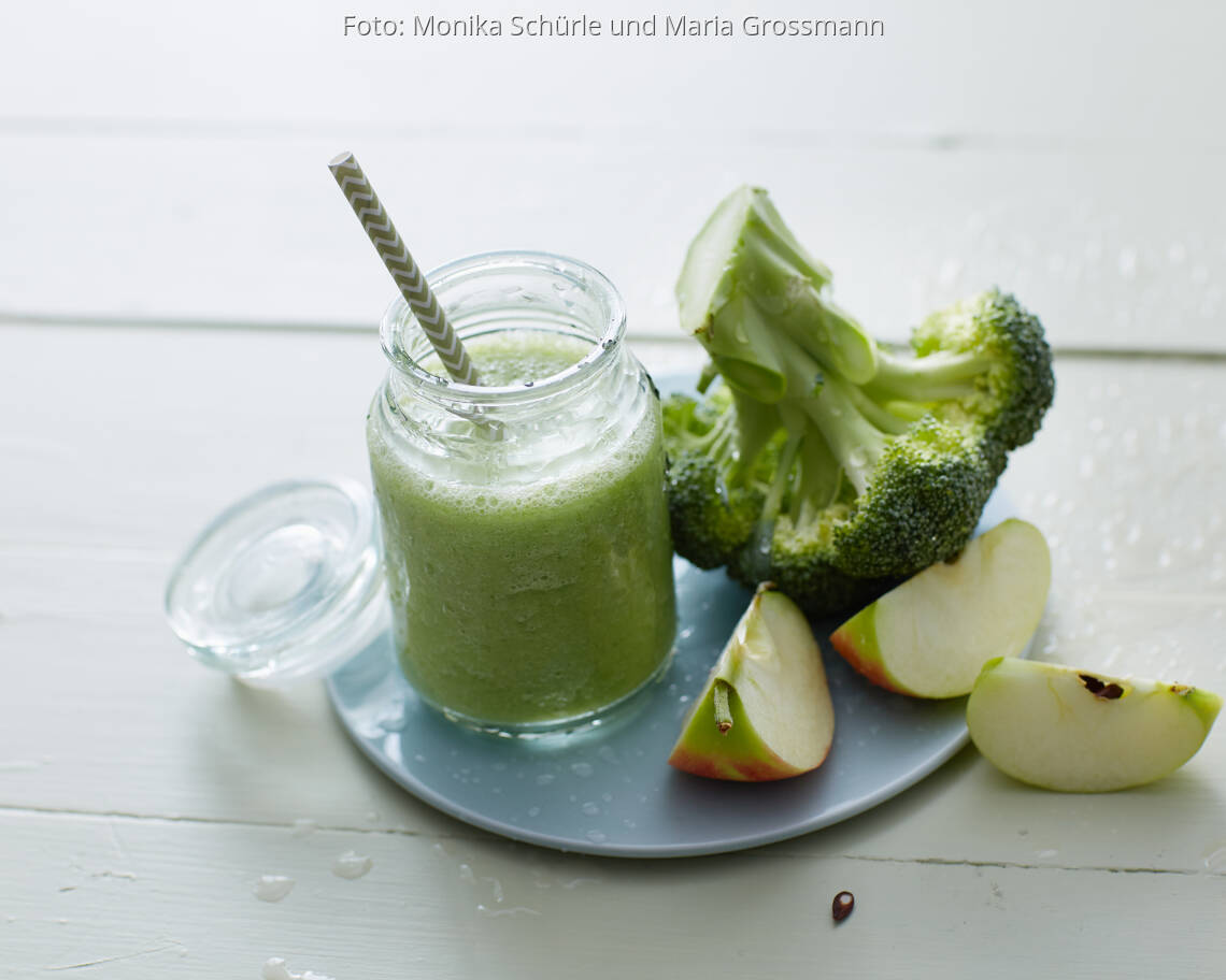 Den Apfel waschen, vierteln und vom Kerngehäuse befreien. Die Viertel in grobe Stücke schneiden. Den Brokkoli waschen und die Zitrone auspressen. Apfel, Brokkoli und Zitronensaft mit Wasser in den Mixer geben. Auf höchster Stufe mixen, bis der Smoothie schön cremig ist. Nach Bedarf noch etwas Wasser dazugeben.
