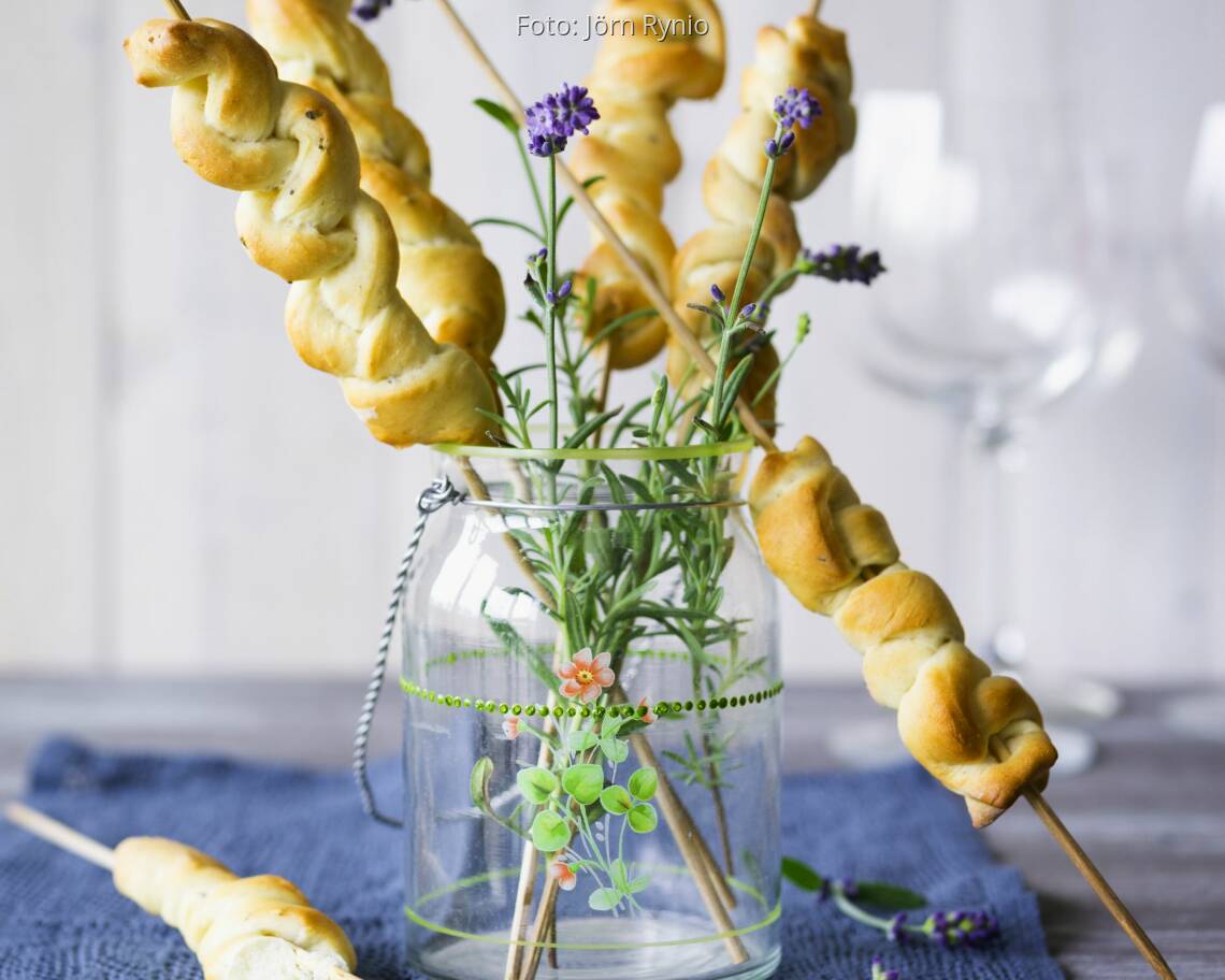 Den Vorteig mit Lavendel, Salz und Olivenöl zu einem glatten Teig verarbeiten. Nochmals abdecken und weitere 20 Min. ruhen lassen. Den Teig auf einer bemehlten Fläche durchkneten und dünn ausrollen. Streifen von 1 cm Breite und etwa 8 cm Länge ausschneiden. Je 2 Teigstreifen um einen Spieß drehen oder flechten. Nochmals 20 Min. ruhen lassen.