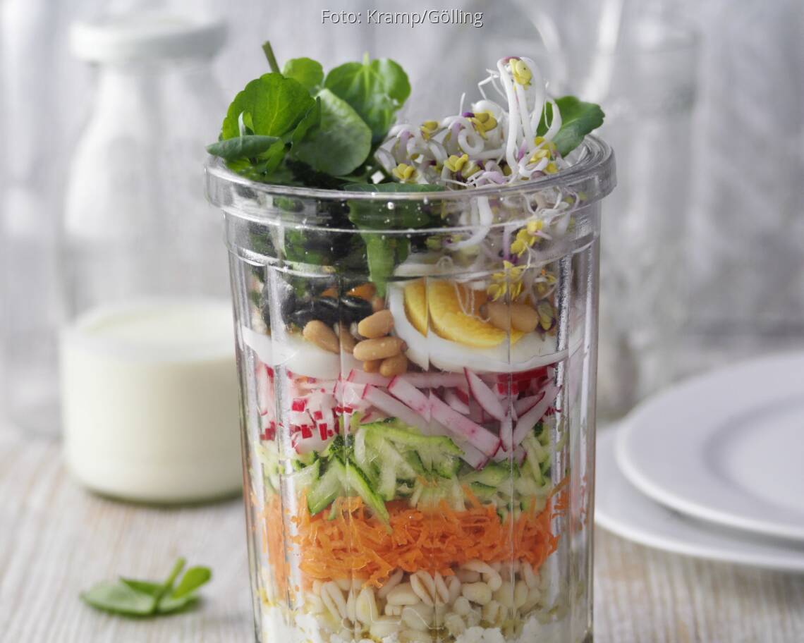 Zuerst das Joghurtdressing in das Glas gießen und den Zartweizen daraufgeben. Dann nacheinander Möhre, Zucchino und Radieschen darüberschichten. Mit den Eischeiben belegen, Brunnenkresse daraufgeben, mit Sprossen und Kernen bestreuen. Das Glas verschließen und (über Nacht) in den Kühlschrank stellen. Zum Essen den Salat auf einen Teller stürzen und gut mischen.