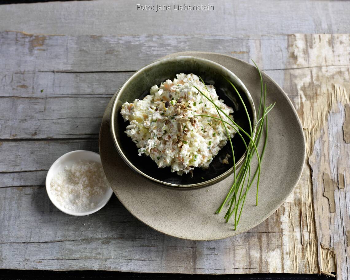 Den Schnittlauch abbrausen, trocken schütteln und in feine Röllchen schneiden, mit den Sonnenblumenkernen (bis auf 1 TL) unterheben. Mit den übrigen Kernen bestreuen. Dazu schmeckt dunkles Roggenvollkornbrot oder Bauernbrot.