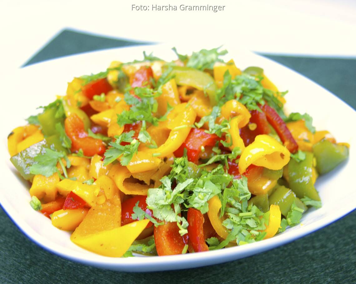 vegetarisches Rezept von Harsha GrammingerBuntes Paprikagemüse wirkt Vata beruhigend ↓ – Pitta erhöhend ↑ – Kapha stimulierend ↓